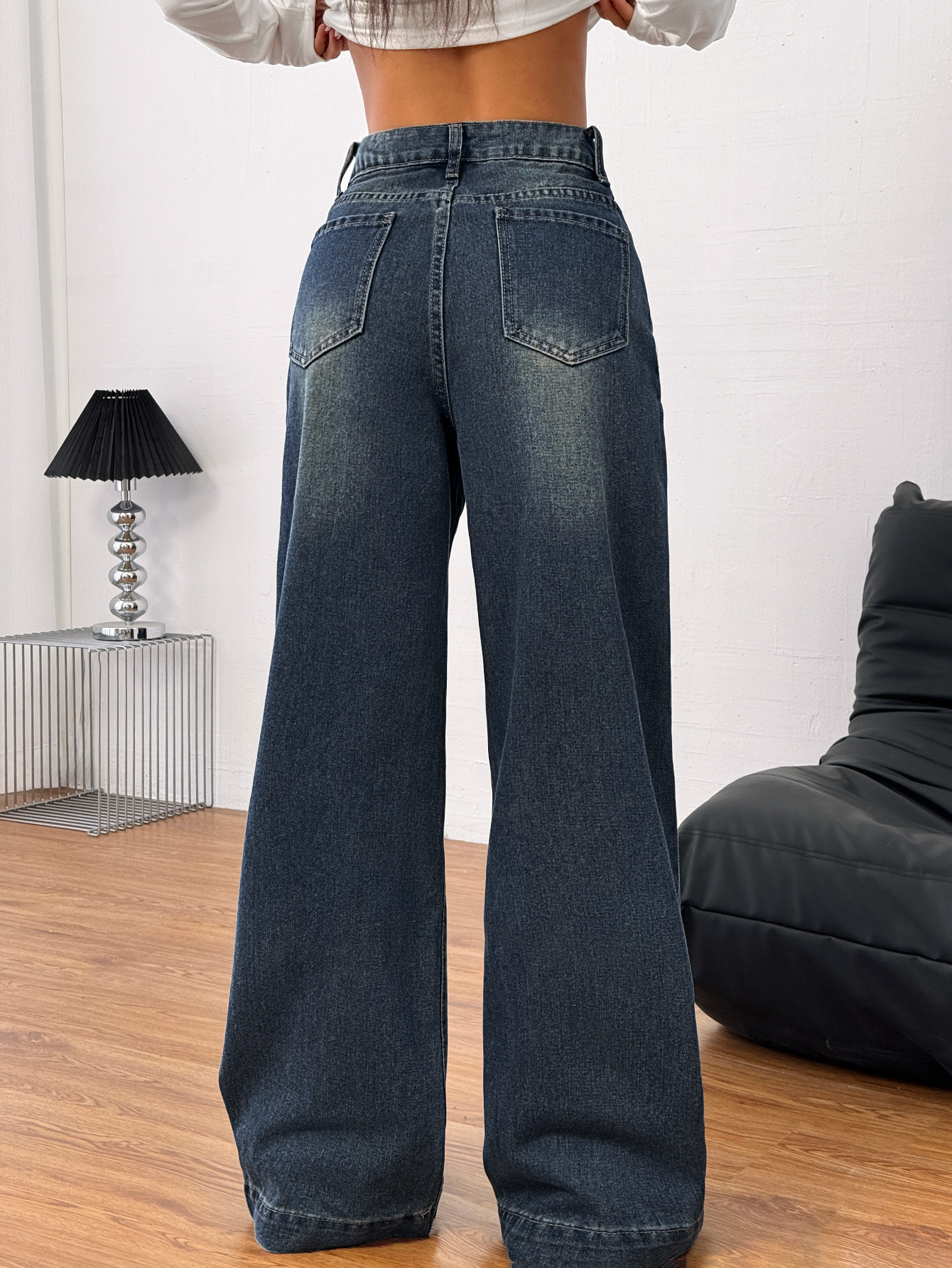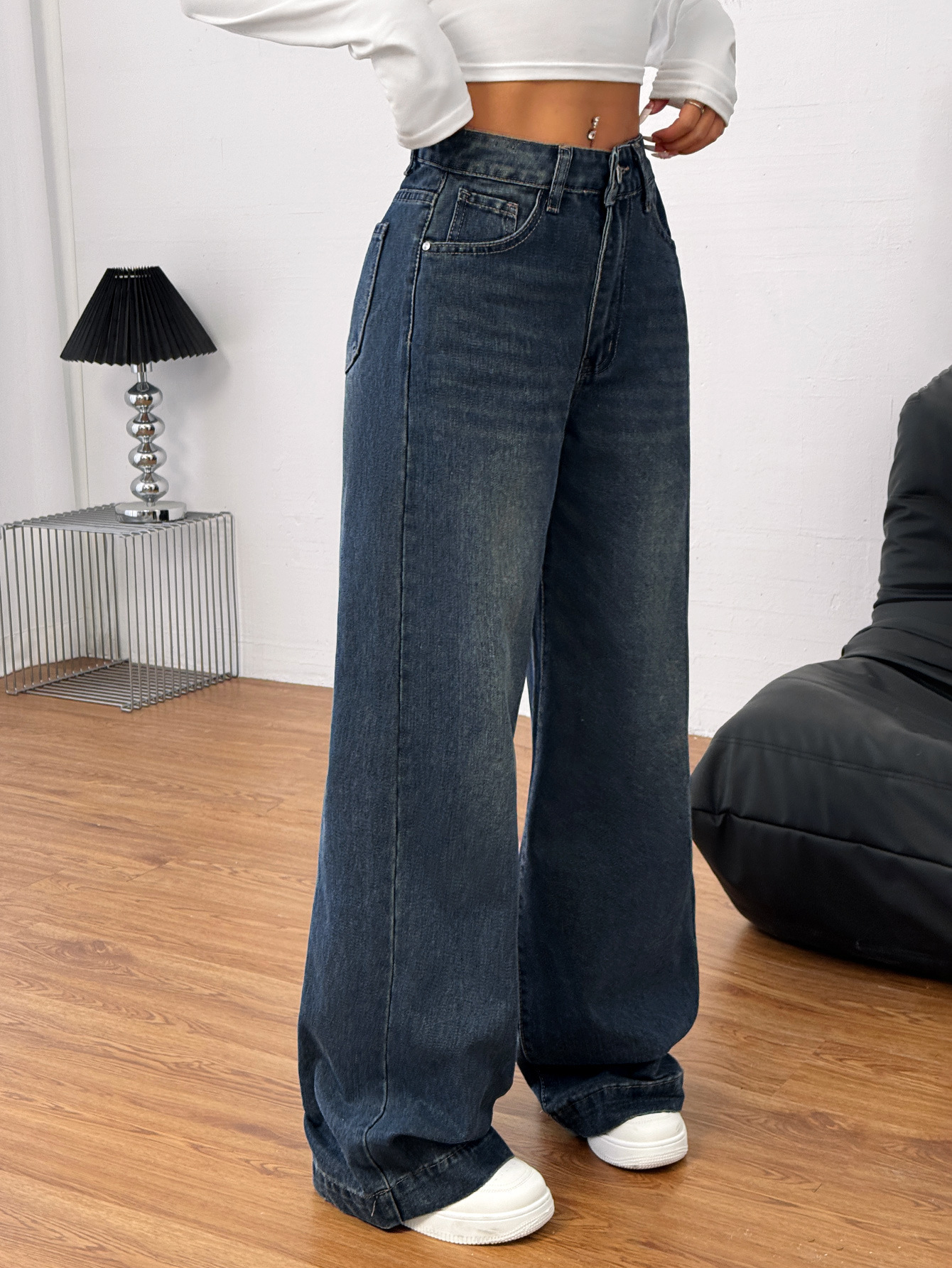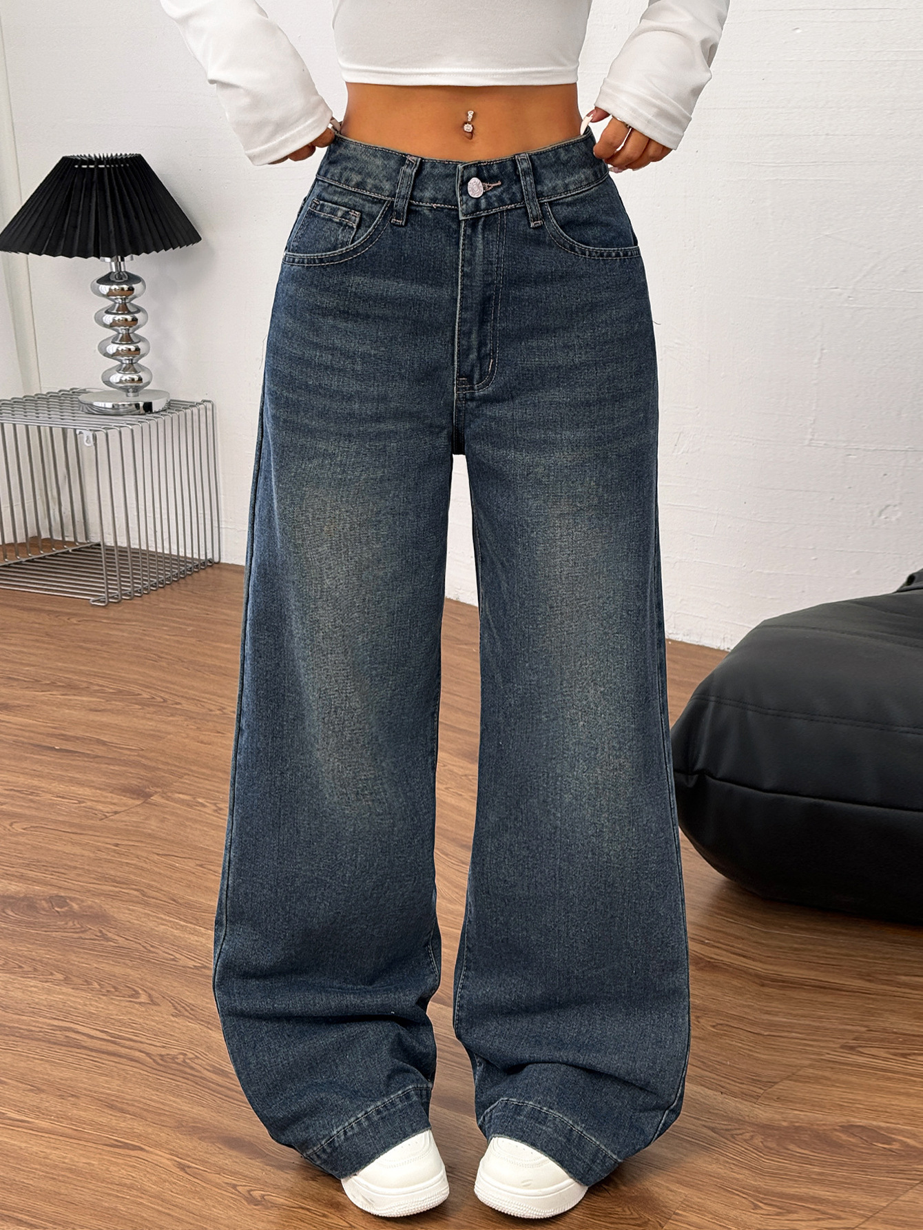 Womens Retro American-Style Long Wide-Leg Loose-Fit Denim Jeans
